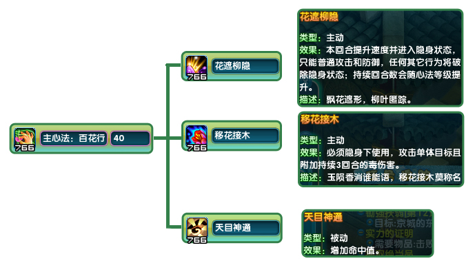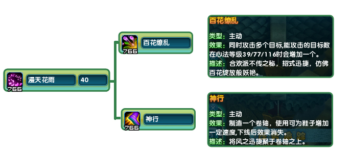 "百花缭乱"是合欢的物理群体攻击,技能12级就能使用,可以秒2,最多秒5练级任务很不错一个技能.虽然伤害不怎么高,大概就是普通攻击的 60%-70%的样子,但是没有先发条件和负面影响..感觉还挺不错的一技能.关于合欢另外一个主要技能"狂风点柳"我目前还没学会,但是这个技能也是不要先发条件也没有负面影响.我在入门派的时候,技能演示中发现,狂风点柳的伤害和"百花缭乱"差不多,也是普通攻击的60%-70%左右波动..嘿嘿.. 虽然伤害不是太BT,因为没有先发条件和负面影响也是相当不错的点杀技能.