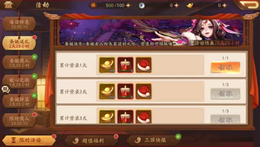 在限时兑换界面,少年们可以用圣诞帽兑换一些银币,培养丹,宝物精炼石等武将养成必备养成资源,而圣诞蜡烛则可以兑换全红将碎片箱,红宝碎片选择箱和红装碎片选择箱等高级稀有资源。