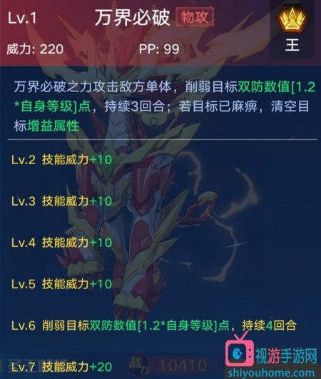 万界必破:万界必破之力攻击敌方单体,削弱目标双防数值[1.2*自身等级]点,持续3回合,若目标已麻痹,清空目标增益属性