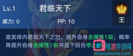 君临天下:激发体内君临天下之力,提升自身全属性1级;概率再提升自身全属性1级并且下回合停止行动