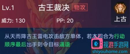 古王裁决:从天而降古王雷电攻击敌方单体,若本回合为顺序最后出手则令目标逼退