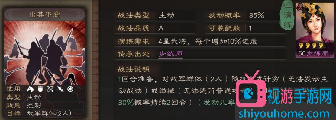 出其不意这个主动战法的效果为,先准备一个回合,然后对地方两人随机造成计穷或是缴械,持续1~2回合,玩家们从步练师那里可以继承这个战法,作为一个群体控制战法玩家们用它来搭配阵容也是比较简单的,如果你的阵容中没有控制带上这个相信会给你不一样的感觉。当然出其不意也并不是所有武将都适合带的,现在来说说哪些武将比较适合它吧。