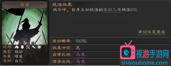温馨提示:白眉这个战法可以通过四星紫将“马良”拆解传承获取,非常适合缺少强力战法的平民玩家携带!