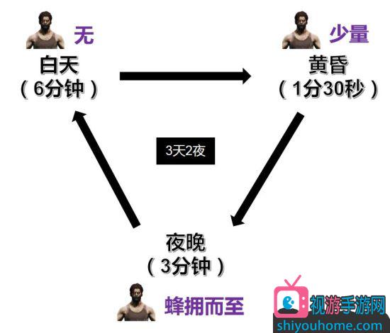 前面小白裙也提到了,在暗夜危机中分为昼夜天气,特种兵们一共需要挺过3天2夜。而天气是会按照“白天(6分钟)→黄昏(1分30秒)→黑夜(3分钟)→白天→黄昏→黑夜→白天”这样的形式循环进行。