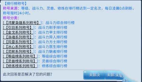 根据每位玩家等级、战斗力、灵兽、修炼在排行榜达到一定的名次,每日凌晨0点更新,排名靠前者可以获得相应的称号,称号时限是24小时。