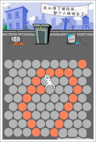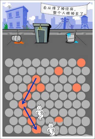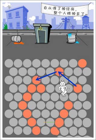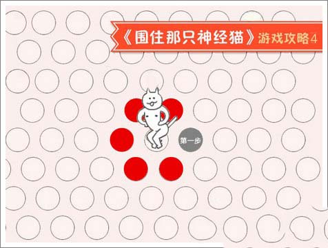 依靠地图上原有的红点,将他们连成一条直线,这样就能在步数上领先神经猫了。利用原有的红点堵住逃跑路线,是围住神经猫的重要技巧。