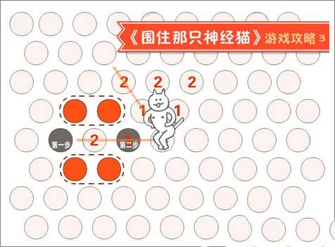 4、江湖传说神经猫最爱往左边或者左上角跑的,在该路线上三步之遥的点周围,开局就要已经有如下图的两个点(成功秘笈:好的开局刷出来);接下来两步把虚线框内的另外两个填满,此时猫在下图中“3”的位置,就这样4步就迎来了胜利!