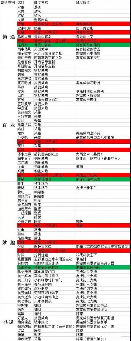 1、目前版本共计有80个奇缘,其中已关闭奇缘为9个,因运营活动结束无法领取触发物品的奇缘为3个,分别在下图中用红色及绿色来进行区分,一骑摇摆奇缘触发疑似运营活动结束,已关闭触发,是否还能完成待定。