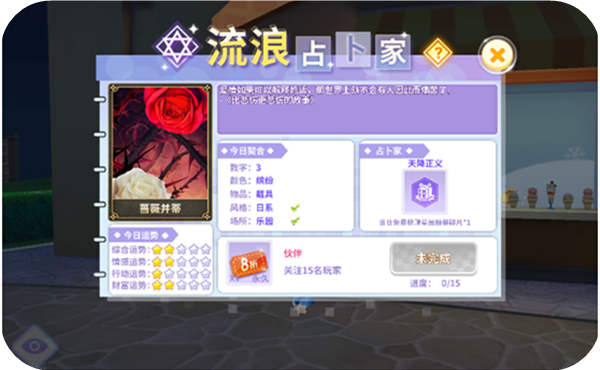 在游戏的交友频道中,会随机刷新出一个名为“流浪占卜家”的十二星座占卜师NPC,只要点击这个NPC,就能进行十二彼方占卜,从十二张卡牌中选择一张,每天只能进行一次的免费占卜。只要你尚未确定选择哪一张,就可以不断刷新,直到你觉得可以了就抽取,一旦抽取,就无法再更换了。