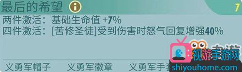 配件方面,首要推荐义勇军套装,首先配件套装自带的受攻击回怒效果配合药剂师配件可以极大的保证西恩快速的释放技能实现高额输出。