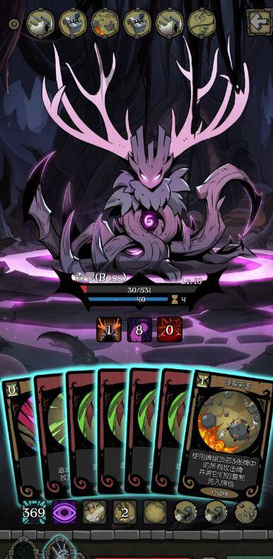 2、玩家能够在游戏中获得一些卡组,玩家根据卡牌中的卡组进行输出方案。森灵有惭悔和扣血上限两个穿刺攻击手段,建议有条件的话血上限超过50打比较好,39血上限必须要在森灵经过两个回合以内打死森灵。弹幕射击一张,钩爪一张,任意加行动卡牌一张,任意有伤害攻击牌一张。还需要额外的3张以上攻工具牌。工具牌建议使用行动牌,可以利用机械师技能定向抽取。