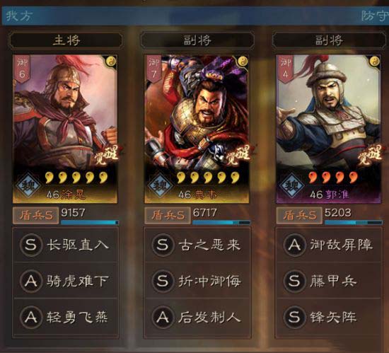 这里准备了两套阵容,一个是双典韦,其中一个拆折冲御侮,保护主将徐晃,另一个是典韦双反击技能,最大化伤害。郭淮作为工具人,自然是带减伤藤甲兵和增强主将伤害和降低副将损失的锋矢阵。