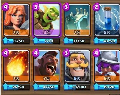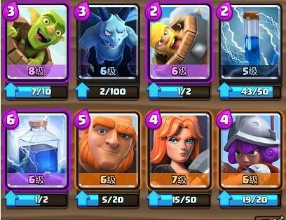 2.小编配的第二套卡组是胖子、皇家巨人强攻卡组。这个是小编大号主卡组的一个替换卡组,胖子和皇家巨任选其一,野蛮人滚筒替换滚木(小编在使用后觉得滚筒比滚木效果要好不少,因此这个号小编就决定一直用滚筒了)。这套卡组的进攻方式很简单,胖子蹲底或者皇家巨人河道下,准备好滚筒和小电,重点清一下小费。防守女武神配合女枪,地面空中防守都极强,很适合6阶之后的上分。