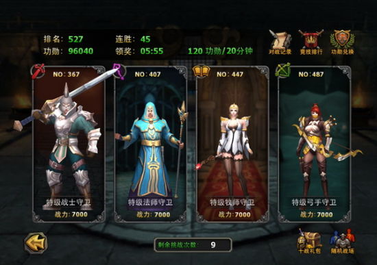 在竞技场中,可以向其他玩家发起挑战,在挑选对手玩家时,可以先查看对方的战力,如果自己的战力能够碾压,或者对自己的技术有信心,那么就可以点击挑战了。根据挑战的情况与结果,会得到一定数量的功勋奖励和金币,其中功勋可以在功勋商店中兑换好物,在此不加赘述。每天有十次挑战次数,如果能够打满十次,无论胜负情况如何,都会获得额外的十战礼包,其中的奖励也十分不错。