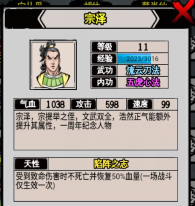 介绍:宗泽,宗提举之子,文物双全,浩然正气能额外提升其属性,一周年纪念人物。