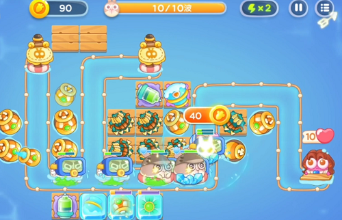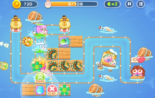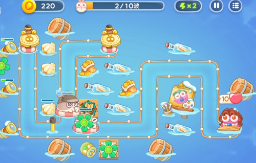 这时候要布置雪球减速了,其实在第4波开始就要布置了,要不然滑板兔跑的太快了。同时冰冻兔也登场了,炮塔密集的地方尽量避免打死冰冻兔。鱼雷尽量布置在出口,能尽早打掉潜水兔的护甲。