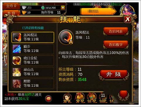 之后可以看情况了,小编觉得先加技能D崩山击是不错的选择,然后加技能B瞬步,能够提高其他技能的伤害,最后加满技能C。当然,也可以先加技能C后加技能D,我们只要保证有两个输出技能就行,另一个只需要它的控制效果。