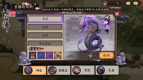 挑战成功,除了掉皮肤兑换材料、金币之外,还能获得一个高级御魂(4~6星,掉落御魂种类,与当日御魂副本一致)。
