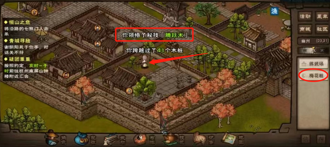 烟雨江湖主角50级正好处在进阶武学的突破期,该拿的进阶武学基本上都拿到了,上乘武学要到60级才能拿,不过50级解锁了3个重要秘技,第一个是腾跃术,去幽州武馆的梅花桩选择“极限挑战”,每次跳个40~60个,跌落的时候就有概率习得腾跃术,很有用的速度类秘技,50级就可以去拿。