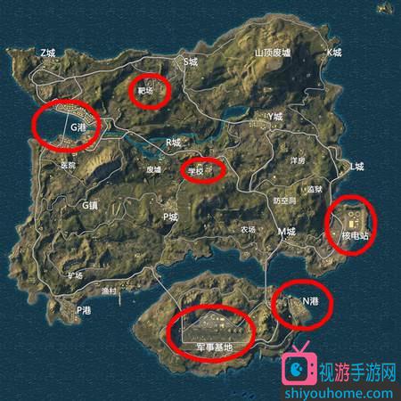 海岛地图:N港、学校、军事基地、核电站和附近的工厂、靶场和G港。