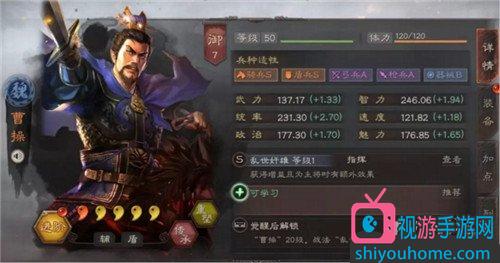 曹操被称为战略版的万金油。具有许多优点:骑兵、盾兵两S级兵种适应性和高统率成长,辅助、奶、肉控制等。曹操自带指挥战法乱世奸雄,战斗中对2名友军提高伤害,对自己降低伤害。做主将的时候,副将给予伤害的话,曹操一定的兵力就会恢复。曹操的自带战法非常适合肉盾,不仅能提高友军的伤害,还能降低自己受到的伤害,对受伤的耐受性和辅助能力也很优秀。在担任队长期间,曹操变得更加肉,通过副将的输出恢复兵力,可以给曹操承受更大的伤害。