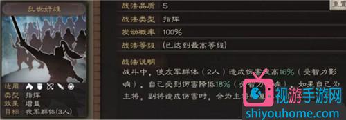 比较强的战法有黄天太平:准备1回合,使自己陷入混乱,让敌军全体陷入技穷,连续2回合。混乱对曹操的影响不是很大,不过作为代价控制敌军整体是很划算的。舌战群儒:敌军发动主动战法时,降低其发动概率,提高与我军的主动战法后发动。通过部署这种战术,曹操的辅助能力将进一步加强。长者之风:通过提高全队的武力,知识属性,与自带战法相结合,可以进一步提高单元的输出能力。 此外,还可以选择锋矢阵、魅惑、挫锐、等战法。