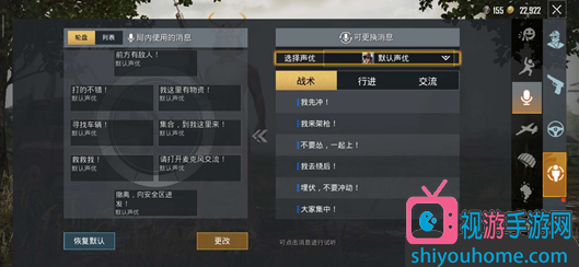 其次,快捷信息分两种模式:轮盘模式和列表模式。轮盘模式操作比较方便,所有的消息呈圆形分布,长按住消息键,将方向拖动至想要发送的信息上即可与队友交流;列表模式需要打开消息键,再选择信息进行发送,列表模式的优点是可以储存大量的快捷信息,而轮盘模式只能储存八条。