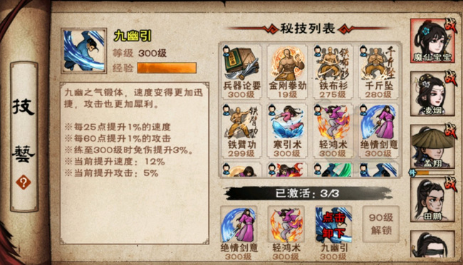 烟雨江湖九幽引学成之后,可以通过击杀怪物来升级,满级为300级。九幽引每25级提升1%的速度上限,每60级提升1%的攻击上限,练至300级时获得3%的免伤,300级时总效果为5%攻击上限+12%速度+3%免伤。