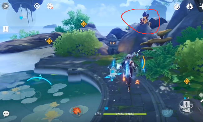 1.进入鸣海栖霞洞天,根据任务指引来到小岛上,打碎如下图所示的岩种子。