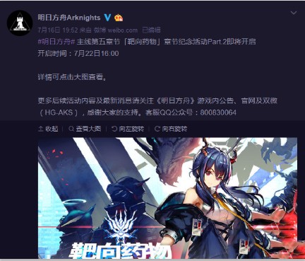 随着时间进入七月中旬,《明日方舟》第五章纪念活动的上半部分也逐渐接近尾声。不知道各位多可塔们在新章节里体验如何?不过从方舟前些日子再次登顶苹果商店畅销榜来看,最近上线的第五章可以说是迄今为止反响最好的一次更新了。不仅地图关卡设计保持了一如既往的高水平,剧情方面也在玩家群体中获得了相当不错的反响。在这个玩家们情绪最高涨的时候,仅持续两星期的纪念活动显然不足以满足大家对于游戏的热情,于是鹰角这边也是顺水推舟地在官方微博公布了“靶向药物”纪念活动下半段的消息。