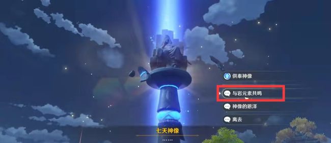 第一步:要先用主角色到供奉岩神瞳的七天神像那里把共鸣开通,如下图: