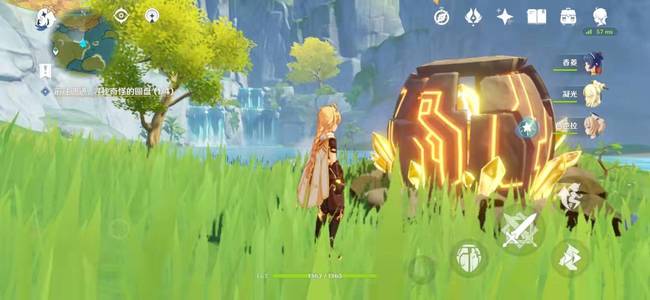 第三步:跑到雷达标记星状位置下,与此同时,细心的亲们会发现左下角多了一个蛋的技能,你需要做的就是在岩神瞳的下面把他释放出来就可以了,如下图:
