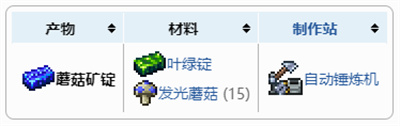 总而言之,我们击杀世纪之花后,在松露人处用1银币购买自动锤炼机 ,同时采集一些发光蘑菇,在自动锤炼机上与叶绿锭一块,就可以制作出蘑菇矿锭了。