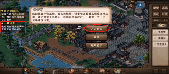 成都(11.7)找张元打听蜀中大侠,选择大侠故居,(15.18)找元吉道人打听《蜀中大侠传》,选择试上一试,点击青羊宫进入地室。