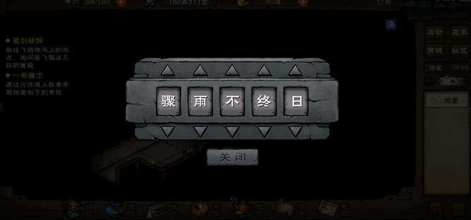 2、进入地室后的第一关是古诗锁,地室(26,25)点击“观察”,看到古诗上阕是“飘风不终朝”,点击(26,24)的石门选择“开锁”,答案是“骤雨不终日”,转动到正确答案就可以打开石门进入下一关的内室;