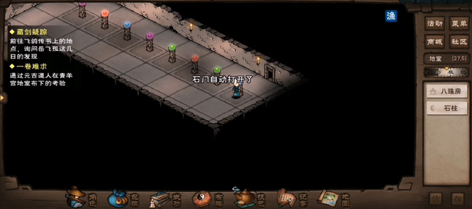 3、第二关是八珠房,要把4种不同颜色的珠子依次放到8个石柱上,放置的顺序是“紫、红、蓝、紫、绿、红、绿、蓝”,很简单,全部放好就会自动打开下一关的石门了。