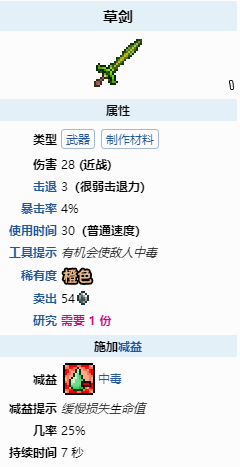 草剑是我们在游戏前期就可以获取的一把阔剑武器,草剑的长度很长,比我们在后面拿到的炽焰巨剑还要长一些。草剑拥有28点的近战伤害,攻击方式为挥舞,有4%的暴击率以及3点的击退能力。