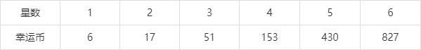 1星→6幸运币;2星→17幸运币;3星→51幸运币;4星→153幸运币;5星→430幸运币;6星→827幸运币