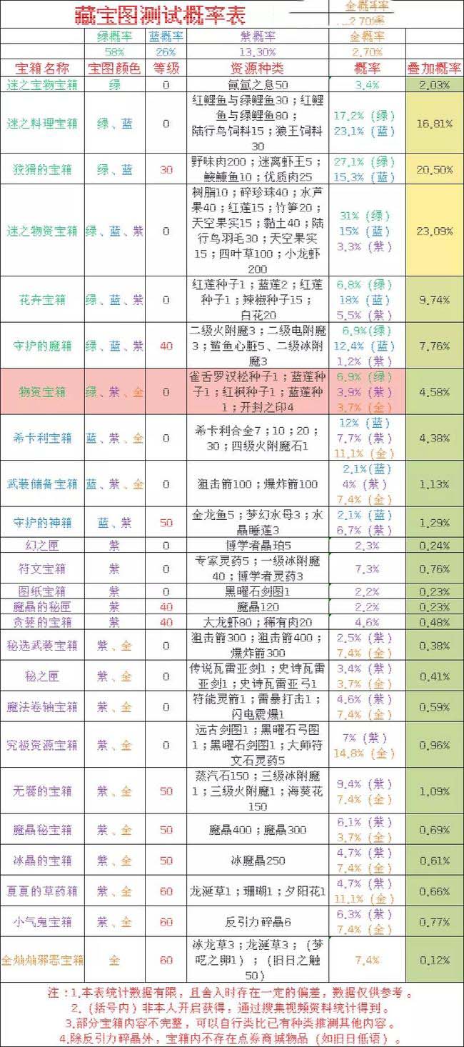 根据不同级别藏宝图,对应的宝箱奖励也不一样,有些级别的宝箱寻找显示出来后还会攻击玩家,藏宝卷宝箱能开出采集物,鱼类,魔晶,卷轴,食物,饲料,附魔石,矿类,反引力碎晶、武器装备各种材料等,可以说能开出的奖励物品很多,开出物品种类及概率可以查看下图: