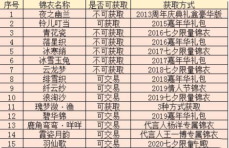 2016年发布的七夕限量锦衣,发售价为2000仙玉。目前藏宝阁女款最低13999,涨幅6900%(相比发售价)。男款最低45000,涨幅22400%(相比发售价)。