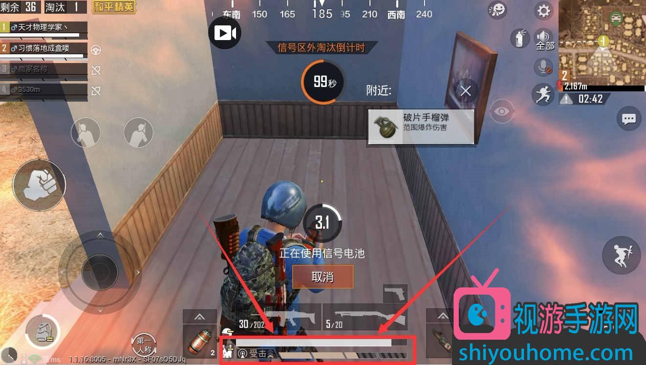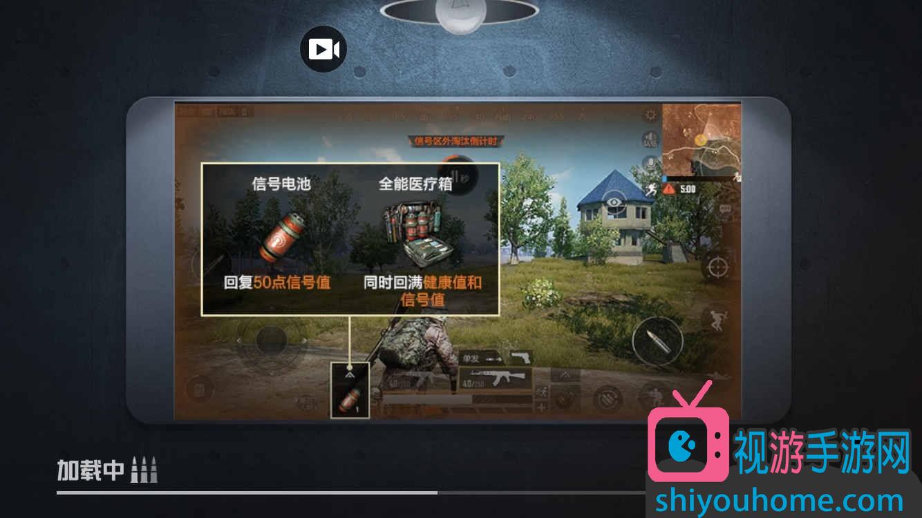 白色线圈内为“信号区”;所有当局游戏的玩家最终的目的便是前往“信号区”刷新后标识的地点,然后通过竞技比拼留存下来的前五位玩家或队伍获得胜利,最后留下的玩家或队伍为本局游戏的第一名。需要注意的是,每局游戏刷新出的信号区都是随机出现的,要时刻关注信号区在小地图中标识的位置。