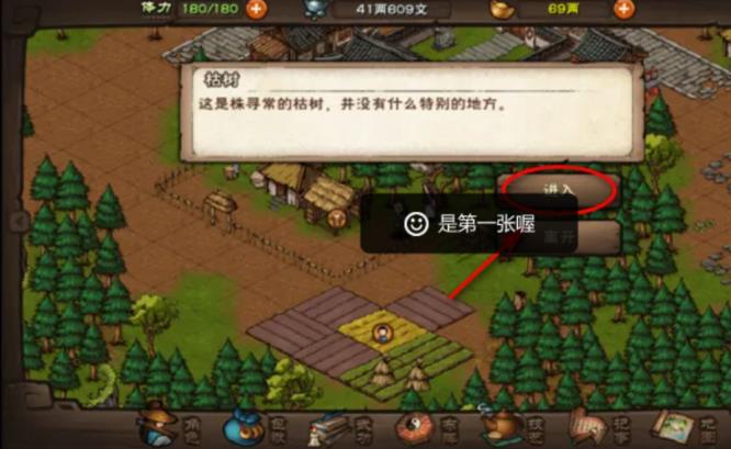 1、想要获得面具,加入拘魂阁后在双王镇场景的23.26坐标点位置点击【枯树】,再选择【进入】选项,这样就能进入到拘魂阁内部了。