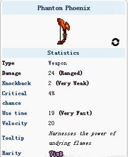 幽灵凤凰是肉山后的一种弓类武器,它也会将常规的箭转化为烈焰箭,每次攻击会发射出2支箭,每4次攻击都会召唤出一只凤凰,遇敌爆炸。玩家可以通过击杀撒旦军队事件中的食人魔小Boss获得。