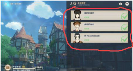 3、然后点击第二个【居民请求】一项,就会看到三个居民委托,大致就是让玩家帮忙跑腿,或者收集xxx材料提交这两种;