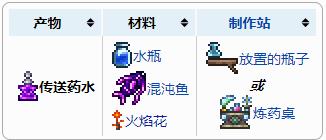 在放置的瓶子和炼药桌附近,使用1个水瓶+1个混沌鱼+1火焰花可以合成1个传送药水。