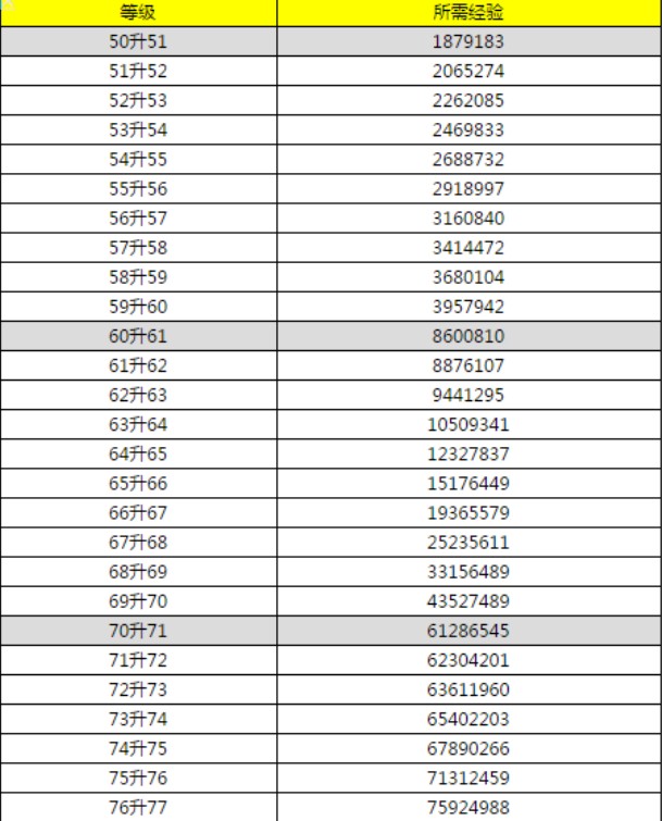 升到69所需要的经验大概为40384700(不含69的下一级经验)。根据70-77级的升级经验规律,小编预计77-80级还需要3亿经验。也就是说70-80级需要接近10亿经验。