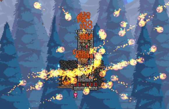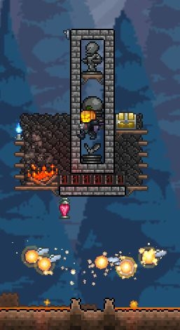 接着武器选择南瓜剑,勾住下层平台位置,用手指按住左键,或找个东西压住左键不放。(下图为白天截取的效果示意图,未吃buff)