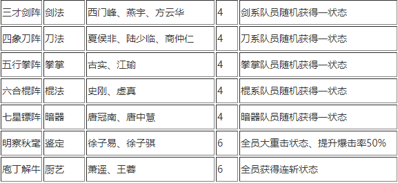 1、连击、连斩、大闪避、 大识破、 大反手、 大横练、 气汇百川(效果下面有说,持续1回合)。