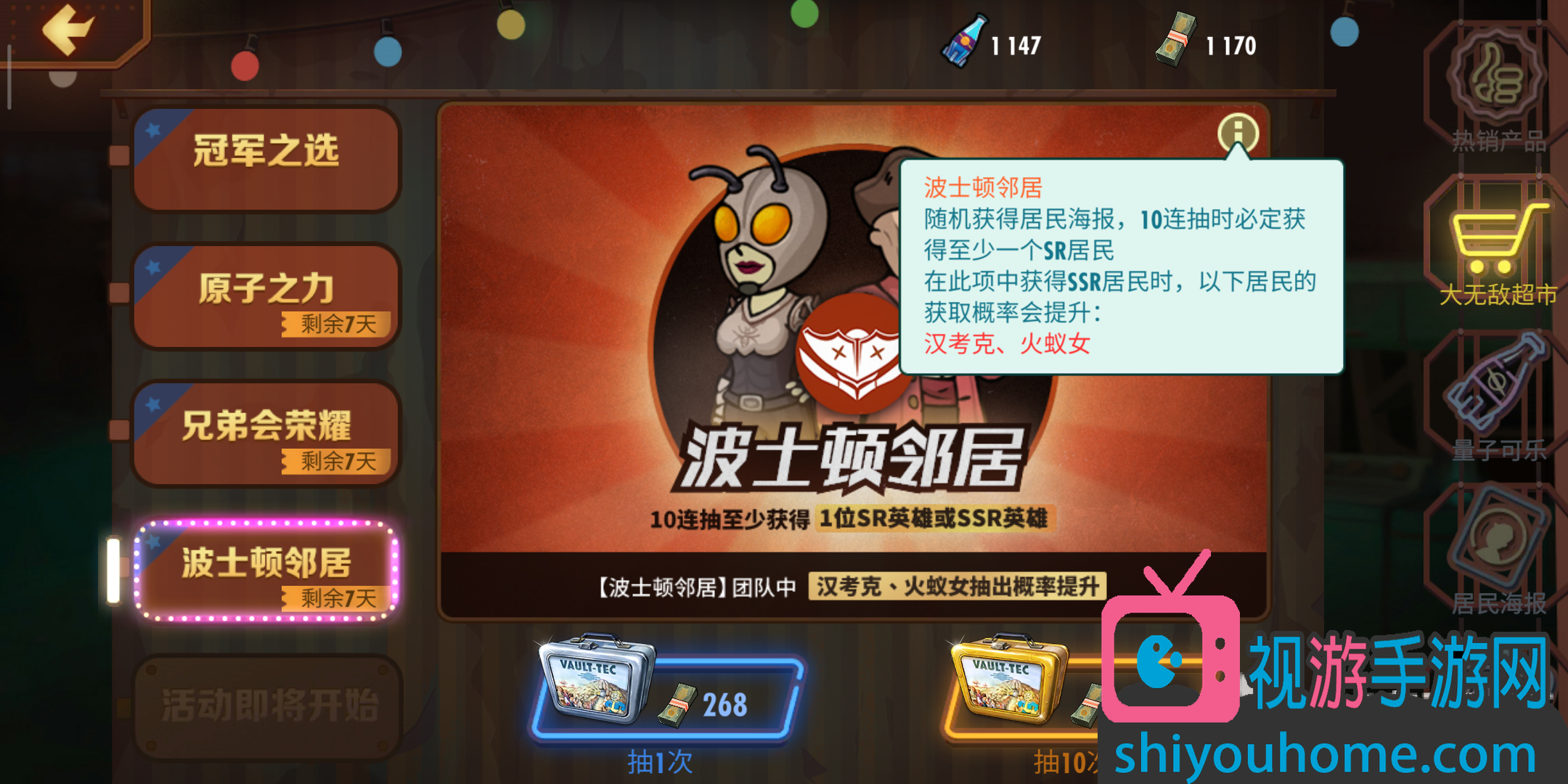 获得李医生的第一种方法就是抽卡,玩家需要前往商城的大无敌超市,就可以抽取居民海报。但是,抽取需要大量的旧货币,而旧货币一般只在活动时才会大量赠送,通过平时的日常任务只能获得少量的旧货币。如果玩家拥有过多的量子可乐,也是可以在商城中兑换旧货币的。
