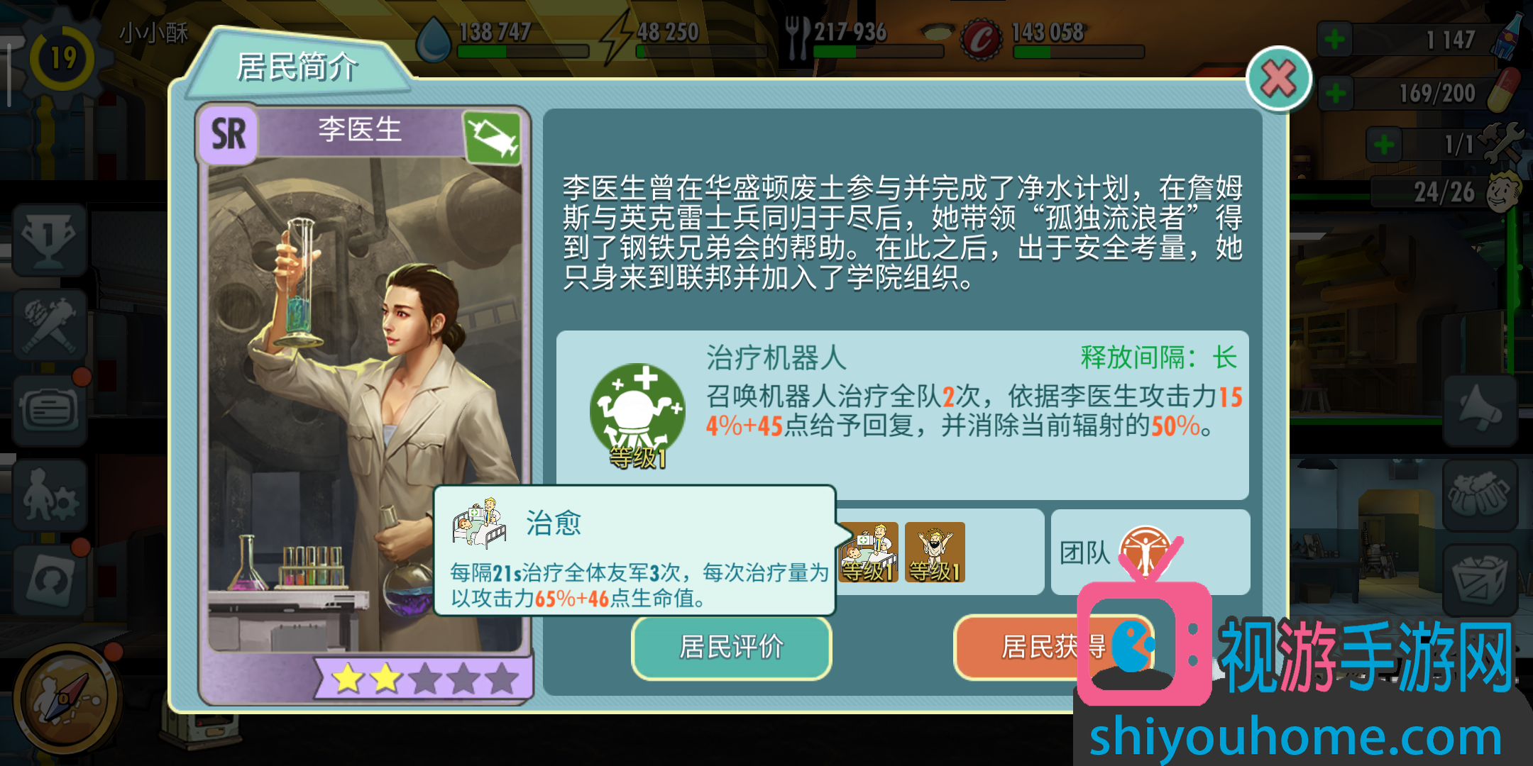 李医生的主动技能不仅可以治疗全体队员,还可以清除50%的辐射值,是游戏中唯二可以清除辐射值的奶妈。